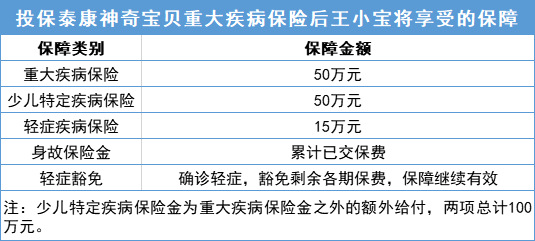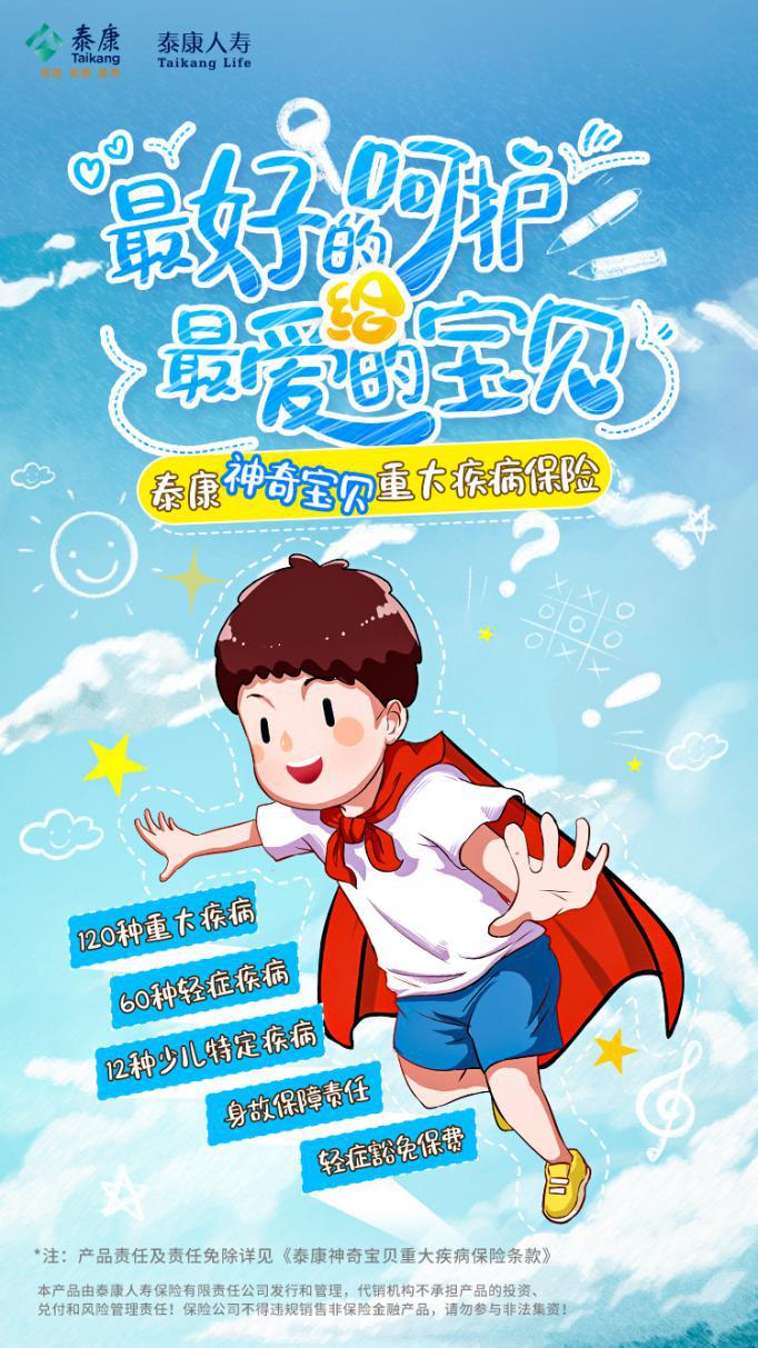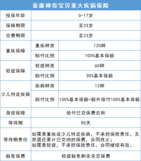 一、涵盖120种重疾、60种轻症,保障全面,家长更安心 当前有不少人认为重疾险内只要包含银保监会规定的25种重疾即可,其他保障多少不重要。但重疾险本身就是为了规避孩子患大病后,家庭无法承受高昂治疗费用的风险。因此,不管重疾的发病率高低,对于个体来说,只有100%或0这两种结局,当然是能够保障的病种越多,风险越小。 对于轻症,当前并没有规定对此进行定义,但许多轻症本质上就是早期的重大疾病,如极早期恶性肿瘤或恶性病变等,在还没有发展成重疾以前,保险公司也会按照一定的比例理赔。因此,轻症的保障全面,也意味着孩子在轻症时期就能够进行很好的治疗,从而避免疾病发展成重疾。 从重疾、轻症保障方面来看,泰康神奇宝贝重疾险涵盖120种重疾、60种轻症,保障范围在少儿重疾险中具有十分明显的优势。而且,作为泰康人寿专门针对未成年人设计的重疾险产品,泰康神奇宝贝重疾险0-17周岁均可投保,保至23周岁,等待期90天,年交保费,在保障期限方面十分适合未成年人。 二、12种少儿特定疾病专门保障,额外赔付100%基本保额 与成人高发重疾不同,儿童高发重疾比较集中于特定的十几种病种。国家卫健委及《国际神经病学神经外科学杂志》相关数据显示,白血病、原发性恶性脑瘤发病率就占据了儿童恶性肿瘤发病率的50%。1—3岁内的儿童,原发性神经母细胞瘤较为多见。因此少儿高发重疾更需要专门的保障。 此外,一旦罹患恶性肿瘤等重疾,不仅患儿备受病痛折磨,更为家庭带来沉重的经济负担。如白血病等恶性肿瘤,其治疗费用少则二三十万,多则高达四五十万,甚至更高。如果能额外理赔,则更加分,泰康神奇宝贝就能够为孩子提供这样的保障。 泰康神奇宝贝重疾险针对12种少儿高发重疾,额外赔付100%基本保额。也就是说,如果基本保额50万,孩子不幸罹患条款内的12种少儿特定疾病,除了给付基本保额50万,还会额外给付50万,也就是获得100万保额的赔付,不管是用于当下治病,还是在获得救治后保障孩子未来的生活,都更有底气。 三、轻症即可豁免保费,孩子治疗期更安心 权威医学杂志《柳叶刀?儿童与青少年健康》披露的最新数据显示,近30年来,我国青少年身体素质情况下降了167%。体质下降,意味着孩子患病的风险增高。尤其是运动量不足、摄入高热量食品等导致的肥胖也在使急性心肌梗塞(轻症)等疾病逐渐呈现低龄化趋势,这些疾病可能不似重疾花销大,但孩子一旦患病,家长时刻关注孩子病情也是无法避免的情况,此时如果还需要担心保费问题,会让家长更加劳心劳力。 泰康神奇宝贝重疾险就包含轻症豁免,孩子确诊条款中定义的60种轻症,即可豁免后续保费,让家长无需在为孩子治病时,还担心保费交纳的问题。此外,泰康神奇宝贝重疾险轻症给付30%基本保额,即基本保额为50万,确诊轻症可给付15万。不仅保额充足,让孩子享受更好的医疗,还不影响后续重疾的保障,十分人性化。 四、低保费撬动高保额,附加口腔检查、重疾个案管理等增值服务 那么泰康人寿这款保障充足的少儿重疾险价格如何呢?举个例子,王先生为刚出生的儿子王小宝(0岁)投保泰康神奇宝贝重疾险,王先生为投保人及身故保险金受益人,王小宝为被保险人及疾病保险金受益人。基本保额50万,保至23岁,交至23岁,年交保费520元。在等待期过后,王小宝将享受以下保障: 从以上可以看到,泰康神奇宝贝重疾险价格比较亲民,投保后几乎不会给家庭增加负担,就能获得重疾、少儿特定疾病、轻症等多重保障,可以说是以低保费撬动高保额的少儿重疾险典范产品。 值得一提的是,泰康神奇宝贝的增值服务也比较优质。购买该款重疾险后,孩子可以享受口腔检查以及全口涂氟1次或窝沟封闭1颗,治疗口腔疾病还有优惠。同时,投保泰康神奇宝贝还可享有重疾个案管理服务,如果孩子确诊罹患保险责任所定义的120种重疾、60种轻症,泰康人寿将为家长配备专属医学经理,提供国内专家门诊、医学陪诊、专家病房等服务,服务内容覆盖诊前推荐、诊中/诊后协助全流程,十分省心。 总的来说,在当前重疾发病率越来越低龄化的情况下,给孩子配备一份含有少儿特定疾病的重疾险产品已经成为大趋势。但每个孩子和家庭的情况不同,家长还需根据实际情况,有的放矢,解决问题。