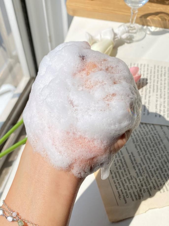 在正式使用前,我把洗发水挤在手上闻了闻,闻到了辣木花的香气,感觉十分清爽!首先香味合格!接着用手揉搓了一下,发现它极易打出泡沫,而且泡沫非常细密。
