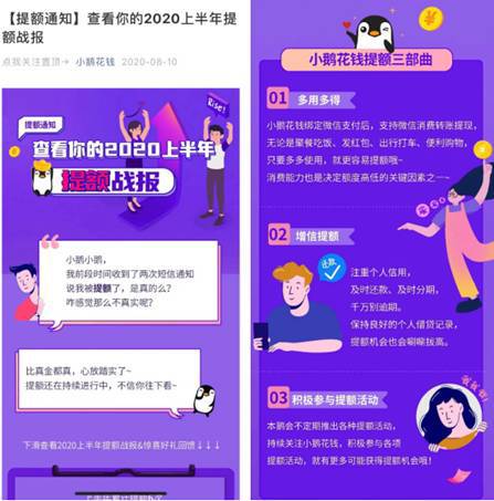 要提额,先激活 开通小鹅花钱,拿到额度后立即激活,避免因为长期不激活额度失效,想用就要重新申请。进入小鹅花钱weixin小程序后点击“立即激活额度”,然后根据提示输入个人信息,绑定,两步就能完成激活!注意:尽管激活小鹅花钱,不用不收费。 多用额,按时还 小鹅花钱具有丰富的使用场景:支持weixin购物、weixin转账,还可以通过小程序借款、分期。当然,一定要养成良好的使用习惯,理性消费,按时还款。小鹅花钱的还款方式非常灵活,广大鹅友可以根据自身需求自由选择。切记,保持良好的使用习惯,是提升额度的关键! 重视公众号,站内福利活动任你薅! 小鹅花钱正在发力做推广,周周免息、邀请好友赚现金是两个最受欢迎的活动,多参与这些活动,不仅能抢到免息券免息,还能薅到15元零钱,更能帮助提升额度! 小鹅花钱每个月会定期公布当月的提额名单,还不赶紧去看下这次提额有没有你! 看完小编总结的这三个技巧,是不是迫不及待地想要尝试提升额度了呢?小编在此提醒广大鹅友,适合自己的才是最好的,不要盲目追求高额度,更不要相信任何机构或个人告知可以帮助提额。提额是由小鹅花钱根据个人的使用记录决定的,所以任何人或机构都无法帮你提升额度,谨防上当受骗。