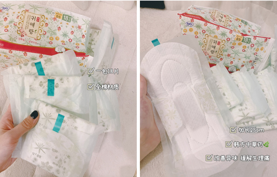 可能大家对“贵艾朗”这个品牌名会有一点陌生,其实它就是之前的贵爱娘卫生巾,只不过换了一个中文品牌名而已。贵艾朗卫生巾从2016年开始,连续5年获得了“中国人喜爱的韩国品牌奖”,2017年双十一期间天猫官方旗舰店销量就突破了20万个,多年来深受中国消费者的喜爱! 我第一次用的是贵艾朗的红色款,这是普通的日用长度,有25cm,像我经期前两天和最后两天晚上量比较少,我就会直接用这款红色的贵艾朗,主要是因为它的吸收力很强,完全不必担心侧漏现象。轻轻从包装上标注的虚线撕开,扑鼻而来的艾草味浸入心田,让人心情愉悦,这主要归功于成分中的艾草。众所周知,艾草是配制中药时经常用到的一剂药材,它不仅能祛湿气、促进血液循环,还可以缓解经期带来的生理痛,瞬间让贵艾朗卫生巾具有了“超能力”。 用手指按压巾体,软棉棉的手感非常好,随意滴几滴液体,都可以瞬间吸收,让使用它的人都能舒服的度过每个月的那几天。贵艾朗卫生巾还有一个特别设计,就是在容易侧漏的地方加了立围防护边,无需担心侧漏,另外它的巾体上还有无数个心形的防漏槽,让经血都能有效的浸入当中,更好的避免防漏,拒绝经期尴尬。 此外,贵艾朗卫生巾不止这款红色的好用,像它的紫色夜用款和绿色加长日用款同样也大受欢迎。比如紫色这款,足足有42cm的护臀垫能够完全贴合并包裹臀部曲线,避免外漏、侧漏,真正做到安心睡眠一整夜。如果晚上量比较少的,可以用绿色这款日月加长版,29cm的长度完全足够。 每个女孩都是自己的公主,想要和我一样改善痛经,恢复活力,呵护健康,轻松度过每月那几日。就请记得一定要选择中草药配方的贵艾朗卫生巾哦!