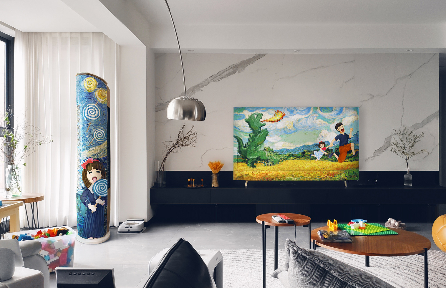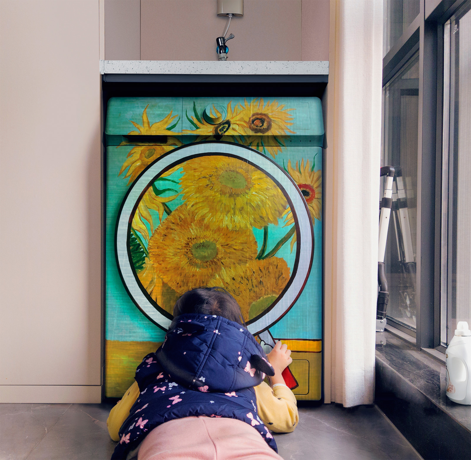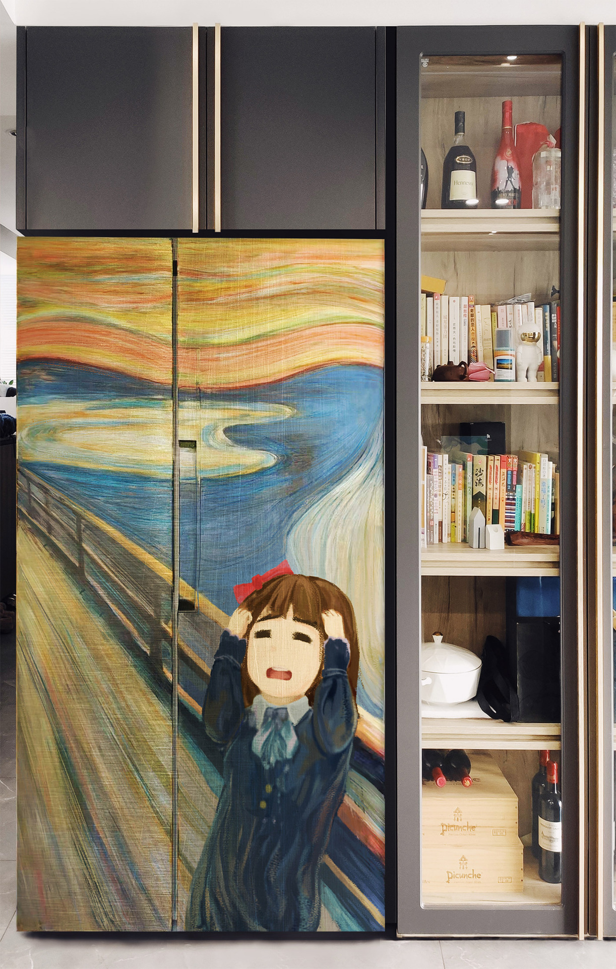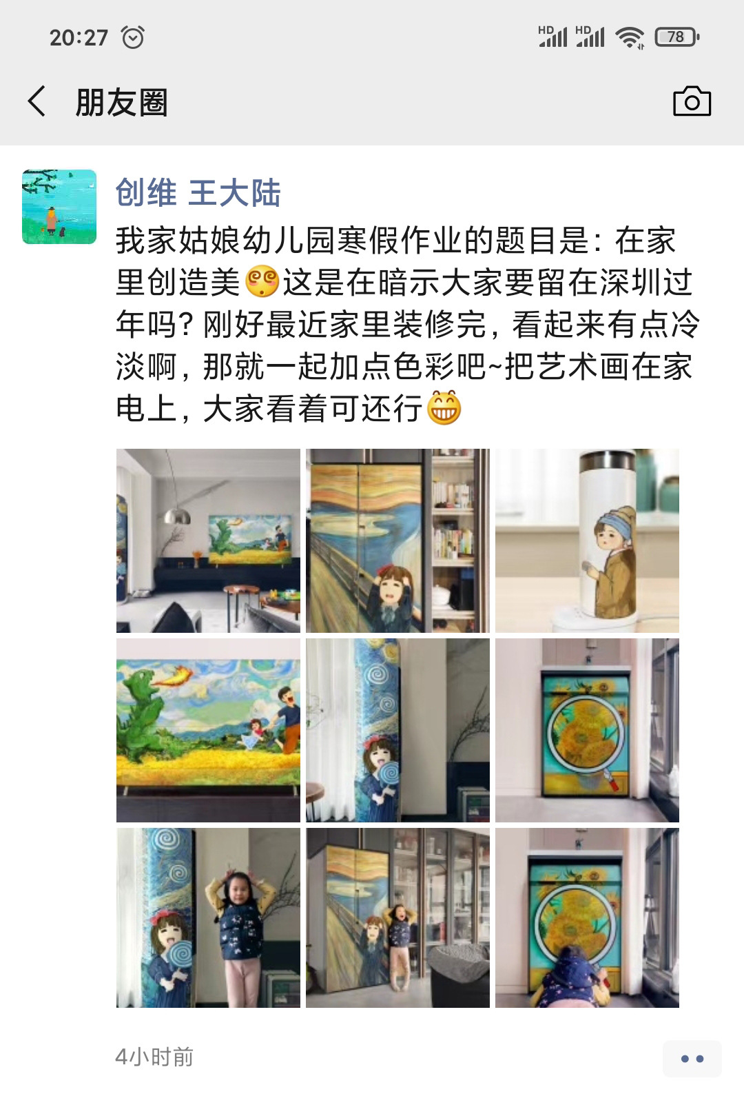 这位爸爸的职业是结构设计师,有一些绘画功底,平时也会指导女儿画画。他说:“我们年前刚好搬了家,家里装修色调有点冷,想加点色彩。所以,看到幼儿园寒假作业的题目,就产生了涂刷家电的想法。”父女俩在家里做手工,几天时间,把全屋家电都变成了艺术品。 既要美观漂亮,又要简单可行,所以,这位设计师爸爸选用的都是一些经典油画作品,比如梵高的《麦田》、《星空》、《向日葵》,还有《呐喊》、《戴珍珠耳环的少女》等经典油画。他还把自家小姑娘也画进了作品里,小女孩在麦田里逃跑、在星空下吃糖、在夜幕下呐喊……造型、创意、艺术性都令人眼前一亮,感觉新颖、可爱又治愈。 画在电视机背后的,是印象派画家梵高的《麦田》油画。原画里的灌木丛变成了怪兽,两棵柏树变成了父女二人。怪兽正在喷火追逐,而爸爸拉起女儿也在奋力逃跑,麦田画面一下子有了动感,还很有故事性。 梵高的《星空》,被画在空调的圆柱形机身上。小女孩正站在星空下吃糖,经典的星空漩涡,都变成了棒棒糖的样子,结合得很奇妙,让经典油画也充满了童趣。 在设计师爸爸的画笔下,自家的小姑娘,不但能够和原画巧妙结合,在《呐喊》这幅画里,还被刻画出了小小年纪的焦虑和脾气,入木三分。可见爸爸对孩子细致的观察了解。 洗衣机的滚筒,被画成了放大镜,小女孩正趴在阳台上观察自然。这幅画结合阳台情景开展创意,同样令人眼前一亮。 在一只电热保温杯上,画的是Q萌版《戴珍珠耳环的少女》画像。这是在爸爸指导下,小女孩的绘画作品。而且,为了呼应保温杯主题,画面上的小女孩还端着杯子,正在喝茶。巧妙的改编,让这一副画显得纯真可爱,又充满了童趣和创意。 难怪王先生说:“这只保温杯,我要放在公司的办公室里,让每一个走过的人都驻足欣赏!” 这一组作品,不仅完美符合幼儿园作业题目“在家里创造美”,还兼顾“花式晒娃”,爱意满满。看完这一组创意作品,网友们也纷纷感叹:“没点才华都不敢去上幼儿园!”、“太可爱了又想骗我生女儿”、“幼儿园就开始这么拼了吗”…… 怎么样,你喜欢这组作品吗? 反正看完之后小编觉得,家里缺的不是孩子,也不是家电,而是一种教育理念!