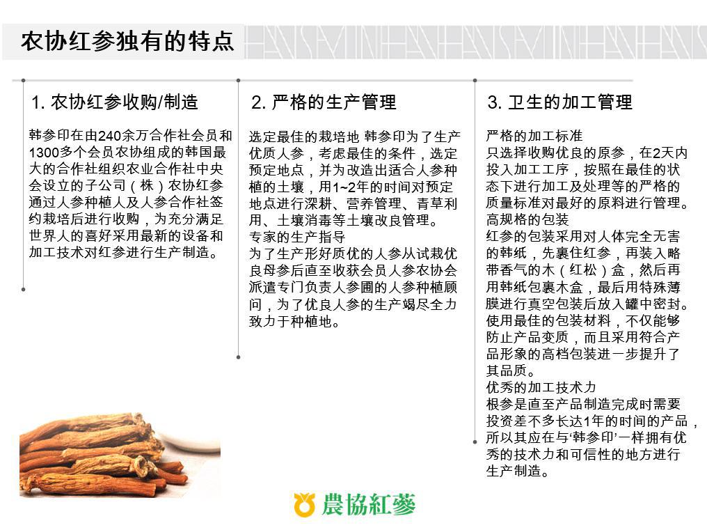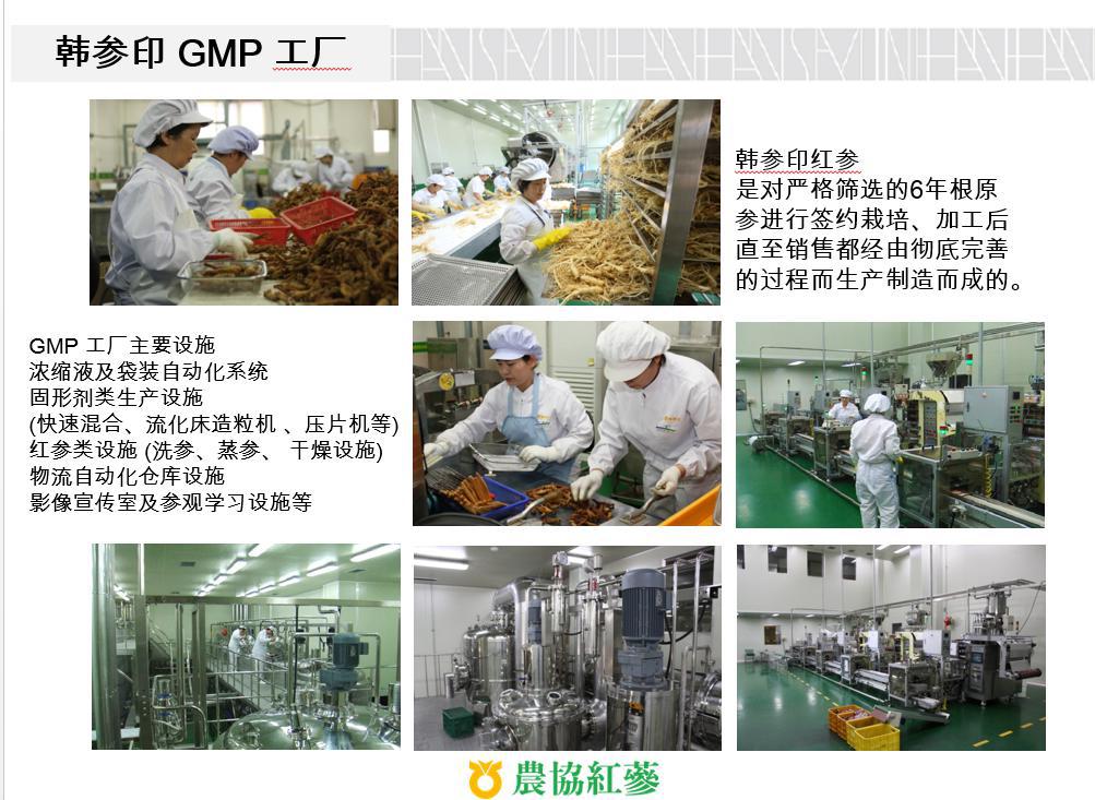 【红参功效】 从保健强身角度来说,红参则是气血不足且偏阳虚者的补益佳品,凡出现经常怕冷、手脚不暖、眩晕倦怠、四肢乏力、易疲劳、气短喘促、时感胃中寒冷、长期腹泻、失眠多梦、 阳痿尿频等表现,都可选用红参进补。 红参是参的熟用品,其加工方法是经过浸润、清洗、分选、蒸制、晾晒、烘干等工序加工而成。红参在蒸制过程中,因为热处理会发生化学反应,成分上发生变化。会生成水参及白参不俱有的新的成分,即红参特有的生理活性物质G-Rh2,Panaxytriol,maltol等。G-Rh2、Panaxytriol有抑制癌细胞增长的作用,maltol具有抗氧化作用。干燥后的红参颜色红润,气味浓香。 红参较白参相比组织致密、坚固、储藏性良好。红参具有补气、滋阴、益血、生津、强心、健胃、镇静等作用。 【人参皂苷】 红参含有高含量的人参皂苷,味道和气味甜中带苦。 与根植物中常见的皂苷不同,人参皂苷是人参和红参中具有特殊构造的皂苷。 【产品特点】 为了更加方便食用加工而成的Anseongmachum红参原液,Anseongmachum原液是以经组合直接收购的韩国产6年根红参为原料,将红参口味和香气原封不动及有效成分也保留了的产品。 【产品包装】 【企业介绍】 农协是以农业人为中心的自主性合作组织,1961年以综合农协的身份成立以来,始终伴随着韩国农业和农村一起成长,是大韩民国代表性的合作社机构。 【工厂设备】 生产销售一体化的安城高品质红参 【香港/迪拜展会】