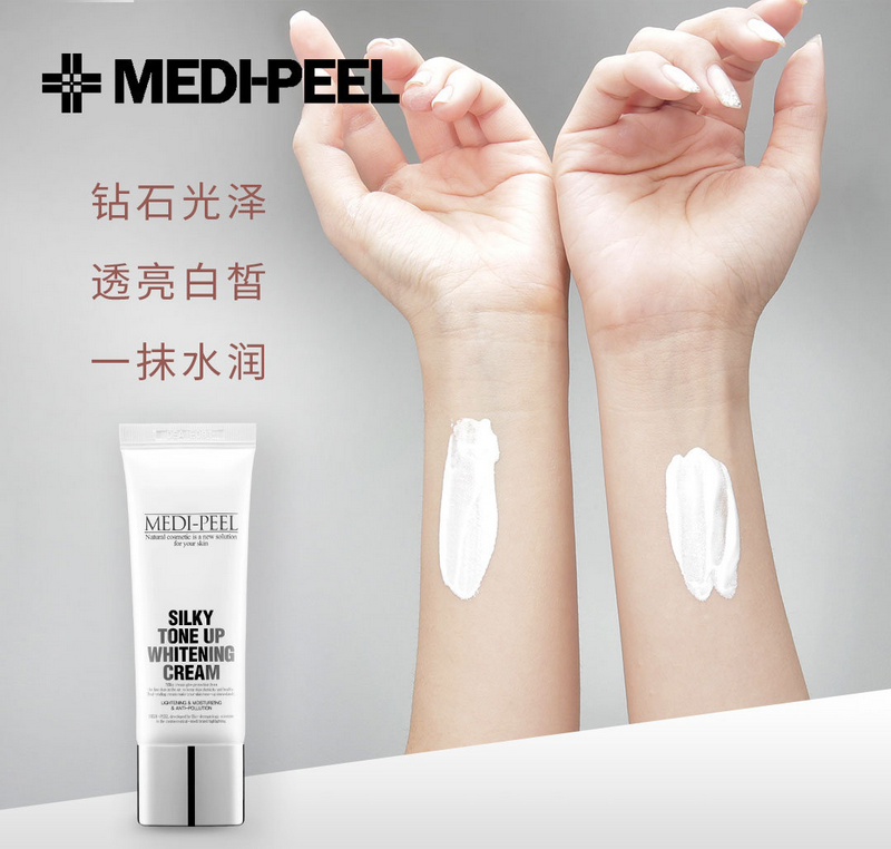 今天就跟大家安利这款美蒂菲MEDI-PEEL丝滑提亮素颜霜!质地是比较轻薄水润乳液,可以看到延展性非常好,非常水润很容易就涂抹均匀了,吸收很快,不油腻厚重,在韩国产品里面算是滋润度比较好的一款了,所以干性肌肤或者油性肌肤使用都是可以的。这款素颜霜中最核心的成分是二氧化钛和硅。二氧化钛能使肤色变白,硅能达到自然提亮肤色的作用。所以素颜霜=面霜+美白提亮。用完之后使人的气色提升,看起来有清透的妆感。而这两种成分都是常用的矿物质粉,对皮肤没有任何伤害。还含有多种维他命成分同时给皮肤提供营养。美蒂菲MEDI-PEEL丝滑提亮素颜霜一抹即白,水润质地,速效上妆,由内而外,透显素净裸妆,味道淡淡的香,抹了一点很容易推开,不会死白,特别润。重点是抹完了皮肤摸上去滑滑的特别自然,不会很黏糊,特别清爽。质地非常水润,轻薄好推开。可能主打“素颜”的效果,所以在使用过程中,的确还蛮好推开的,延展性很好,吸收之后更加自然不假白,清爽不油腻,不会闷痘,手残党也不怕抹不匀。涂完以后气色真的好了一大截,肤色提亮效果也很柔和。内含多种维他命成分,可以帮助美白提亮肤色,还可以修饰遮盖脸上的小痘印斑点,改善暗沉效果特别好。很好推开,而且好吸收,上脸也是超出想象的滋润。同样有修饰肤色的作用,毛孔斑点痘印都可以遮盖,而且内含VC成分,有美白提亮效果,还自带隔离配方。